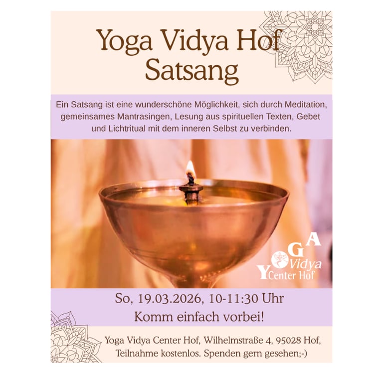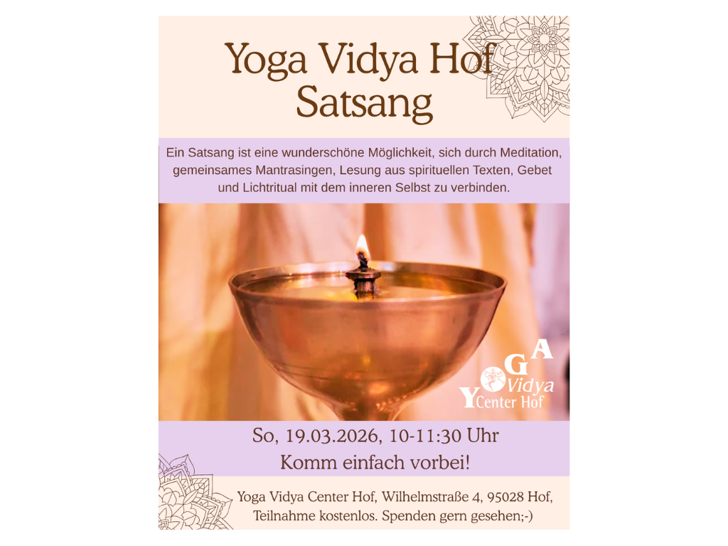 Bei Yoga Vidya Hof hast du die Möglichkeit einmal im Monat einen Satsang zu besuchen und spirituelle Gemeinschaft zu leben. Außerdem gibt es immer wieder besondere Events wie Singing-Circles, Konzerte, Mandals malen und special Workshop-Tage.